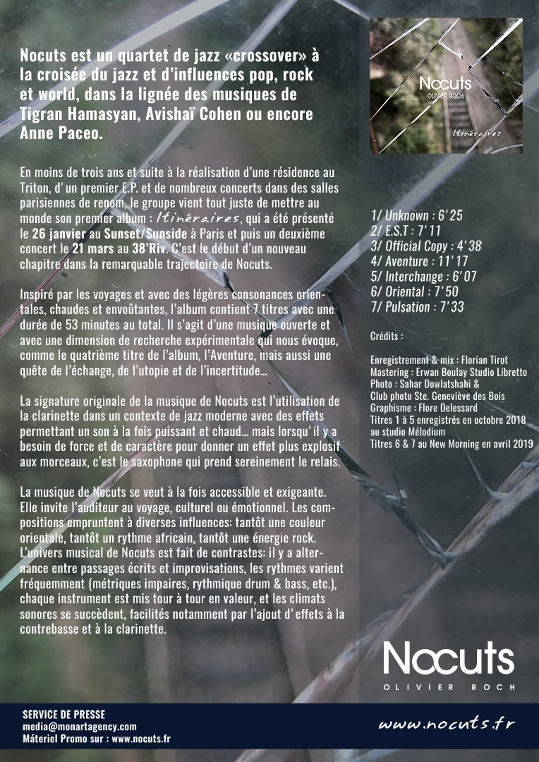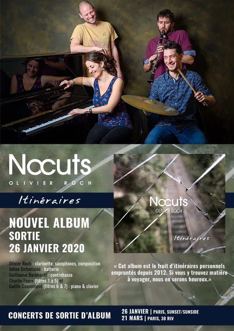 En moins de trois ans et suite à la réalisation d’une résidence au Triton, d’un premier E.P., et de nombreux concerts dans des salles parisiennes de renom, le groupe vient tout juste de mettre au monde son premier album : Itinéraires, qui a été présenté le 26 janvier au Sunset/Sunside à Paris et puis un deuxième concert le 21 mars au 38’Riv. C’est le début d’un nouveau chapitre dans la remarquable trajectoire de Nocuts.